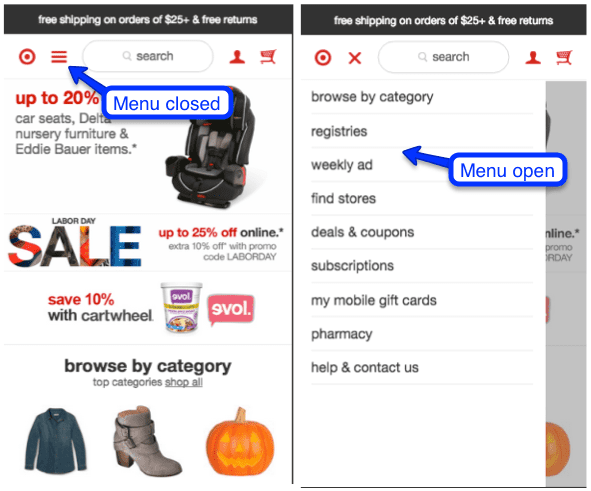 The “hamburger” menu is universally recognized and a very mobile-friendly solution to navigation—and it also respects the generally accepted idea that mobile navigation should take, at most, three taps to arrive at the desired page. Ideally, you should have just one sub menu under each menu category for ease of use. Be sure to put your most important pages first.