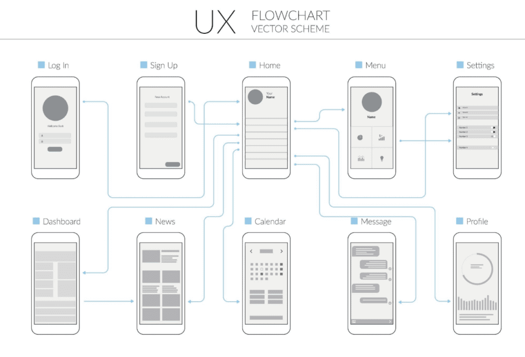This flowchart starts with the log-in screen and goes to the home page. If a user doesn’t have log-in credentials, they’ll need to sign up. From the home page, users can access the side menu for navigating to top features and pages. The flow chart includes a settings page and app dashboard as well. Your app will likely have all of these.